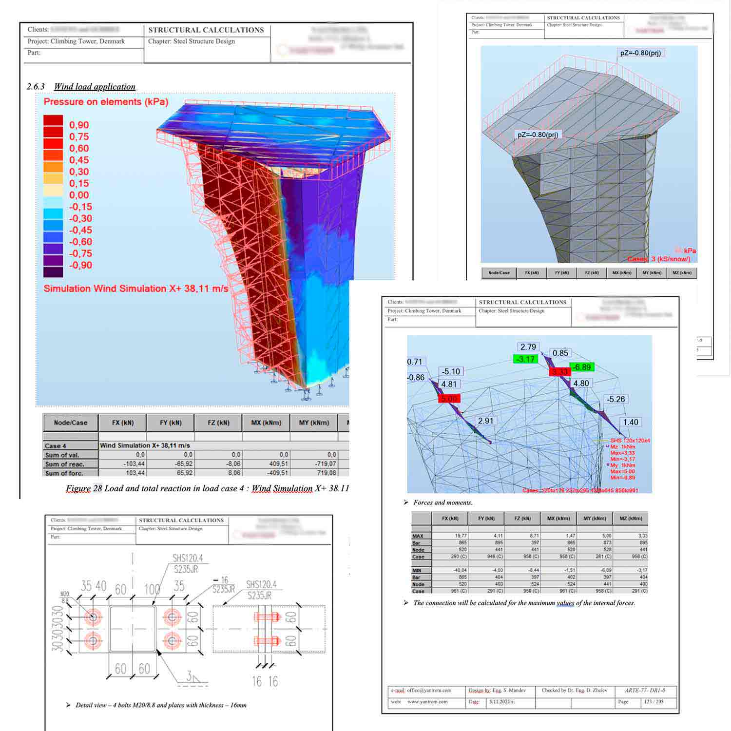 Sobald der Entwurf Ihrer Kletterwand oder Ihres Kletterturms fertiggestellt ist, erstellen wir die notwendigen technischen Berechnungen. Wir analysieren alle auf die Struktur einwirkenden Lasten und Kräfte und stellen sicher, dass die Materialien richtig dimensioniert sind. Der Bericht dokumentiert die Einhaltung aller relevanten Normen und Eurocodes und garantiert so die strukturelle Integrität.